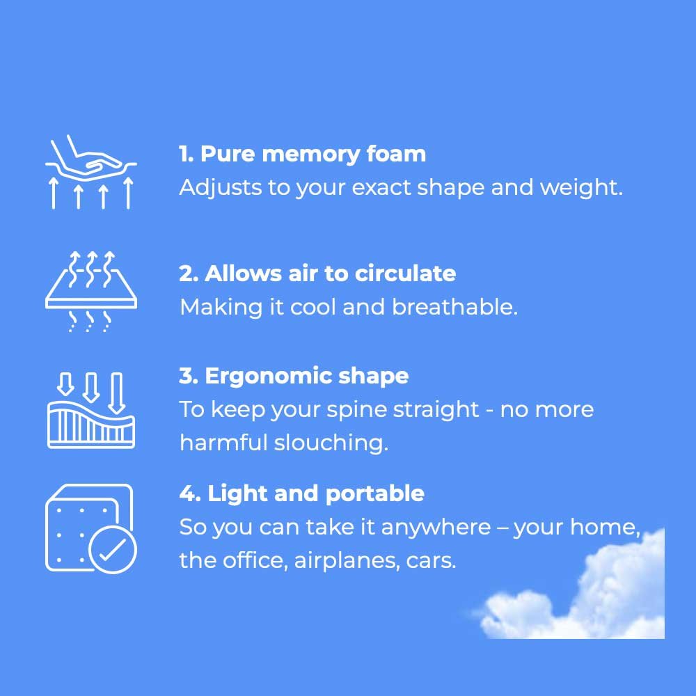 - Vielseitigkeit: Perfekt für den Einsatz auf Bürostühlen, Autositzen, Rollstühlen, Bänken und Flugreisesitzen gleichermaßen – sein anpassungsfähiges Universaldesign passt sich perfekt an verschiedene Sitzumgebungen an.